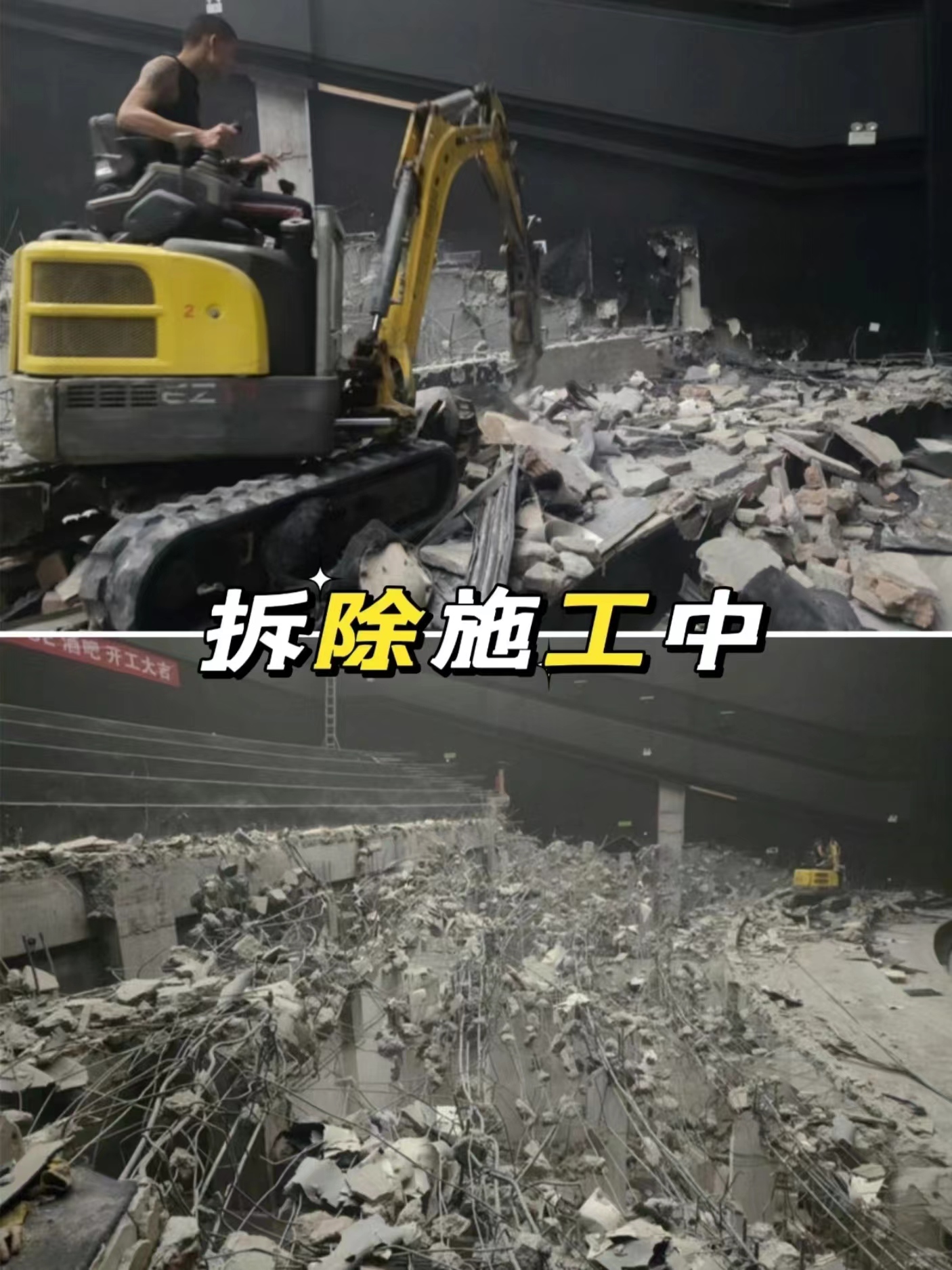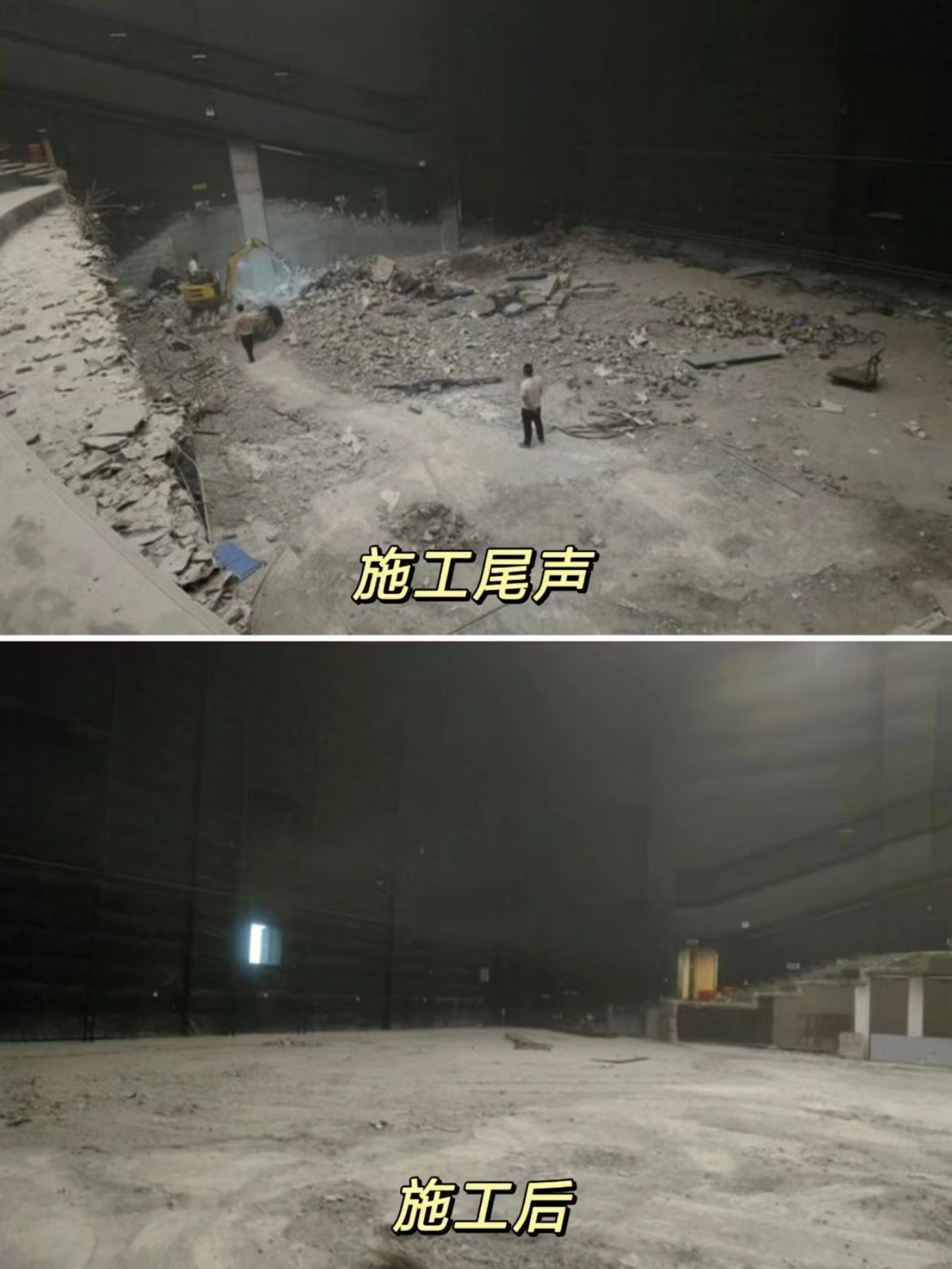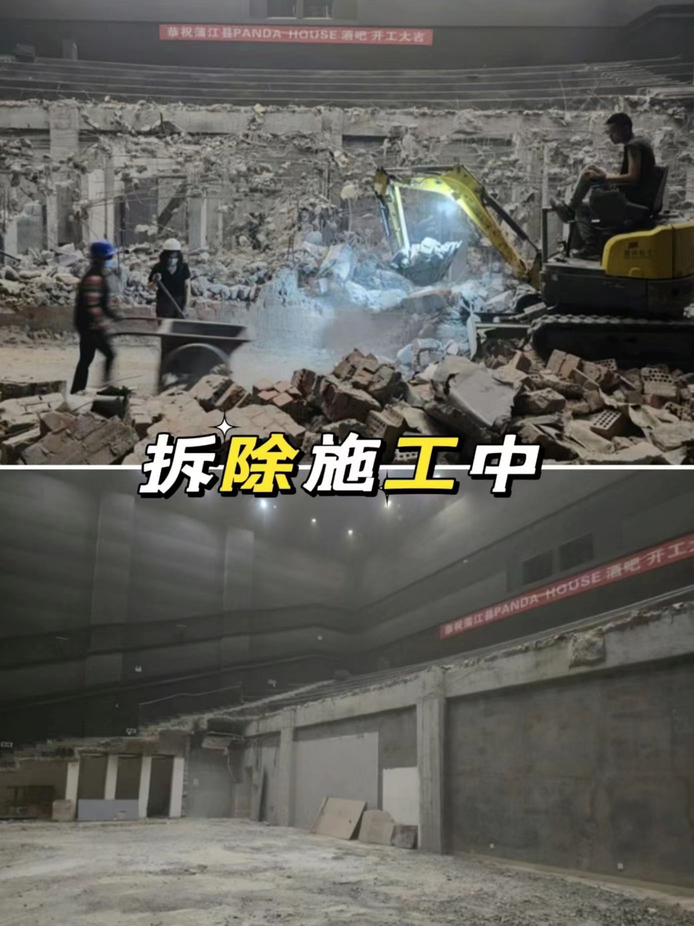 這個案例是商家通過線上找到我們,是蒲江原本一個巨幕廳,現準備全部拆除,裝修成酒吧,所以需要對階梯等室內設施進行拆除。