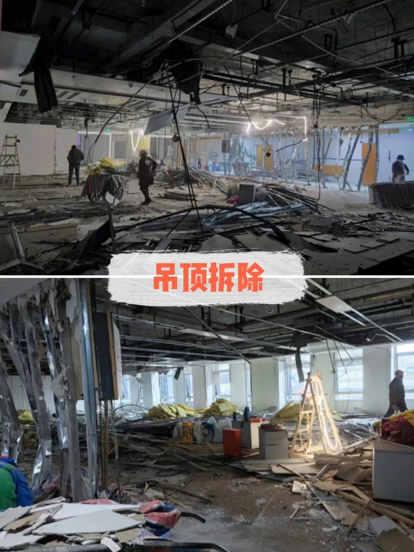 很多人認為吊頂拆除很簡單,因為大多吊頂都是用的輕質材料,其實不是的,一個需要高處作業,施工沒有地面那樣方便;二個是吊頂部分灑水噴頭,需要小心施工。